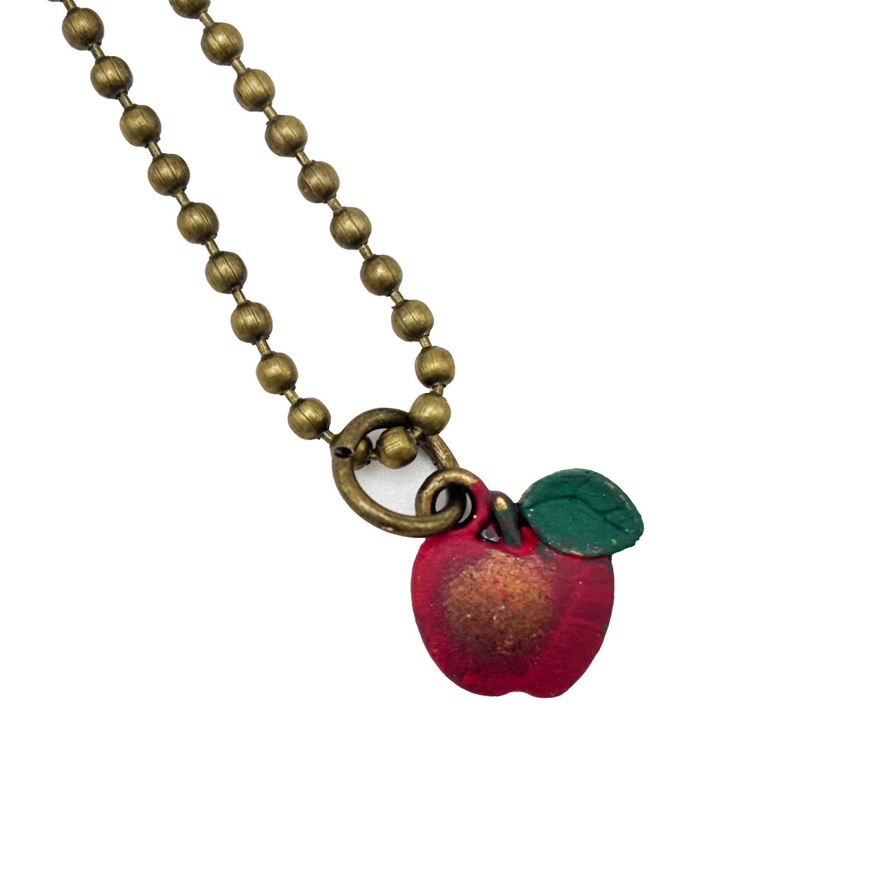 Antique bronze apple charm painted red with a green leaf and burnished to shiny gold. Shown with 18" antique bronze ball chain.