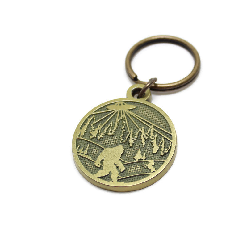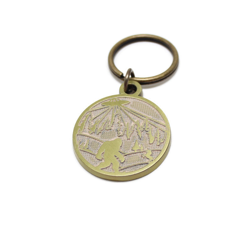 Antique bronze 1 3/8" charm keychain on 1 1/4" keyring. Whimsical charm with illustration of bigfoot, a UFO and a unicorn. The reverse says "Believe in Yourself." Antique bronze painted olive green and burnished.