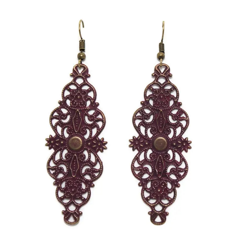 Graceful vintage swirls encircle a bronze button in the center of these long but lightweight earrings.