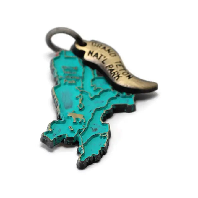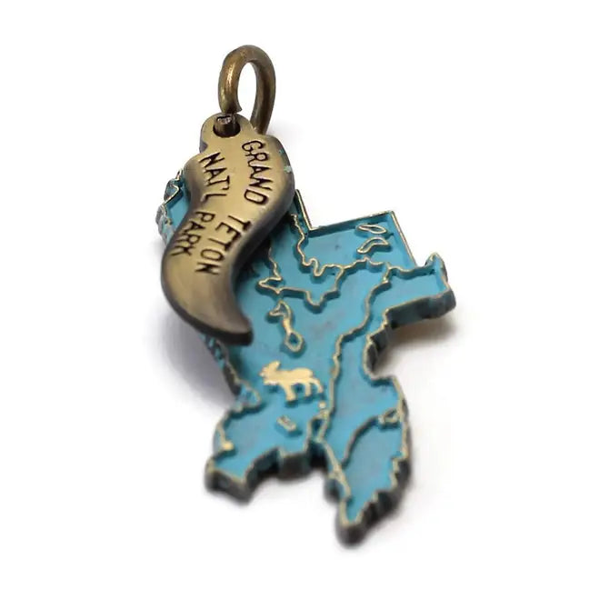 Explore the iconic beauty of the Grand Tetons of Wyoming with our detailed national park charm featuring the park map and a majestic moose.