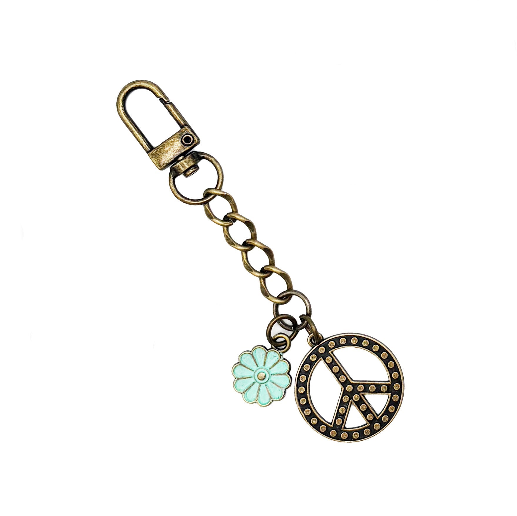 Hand-painted bag charm with peace sign and daisy, 4.5 inches, hypoallergenic, doubles as keychain.