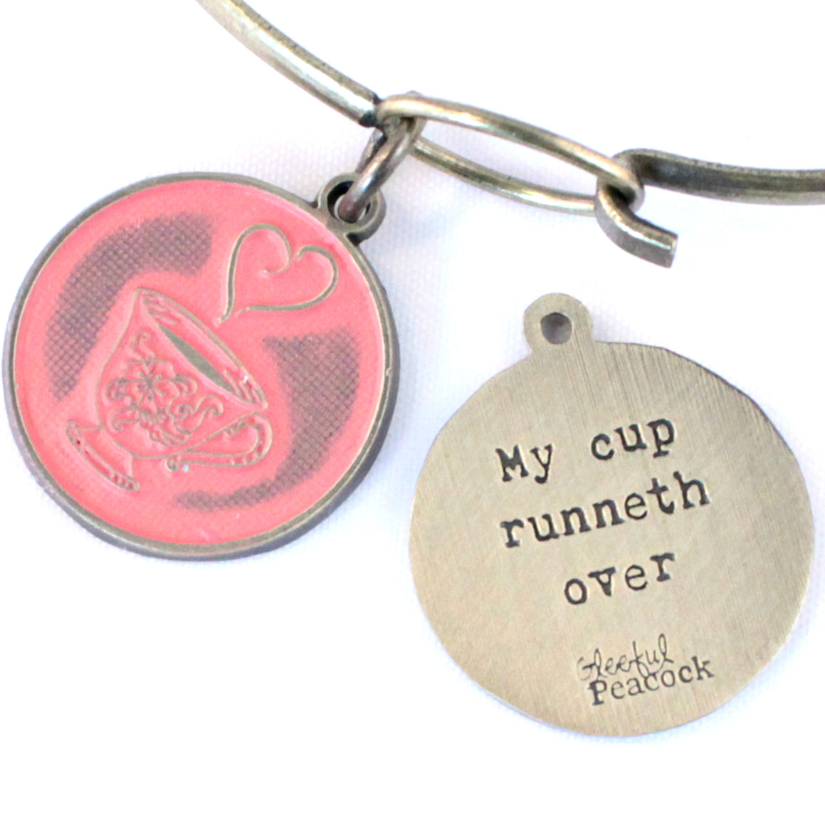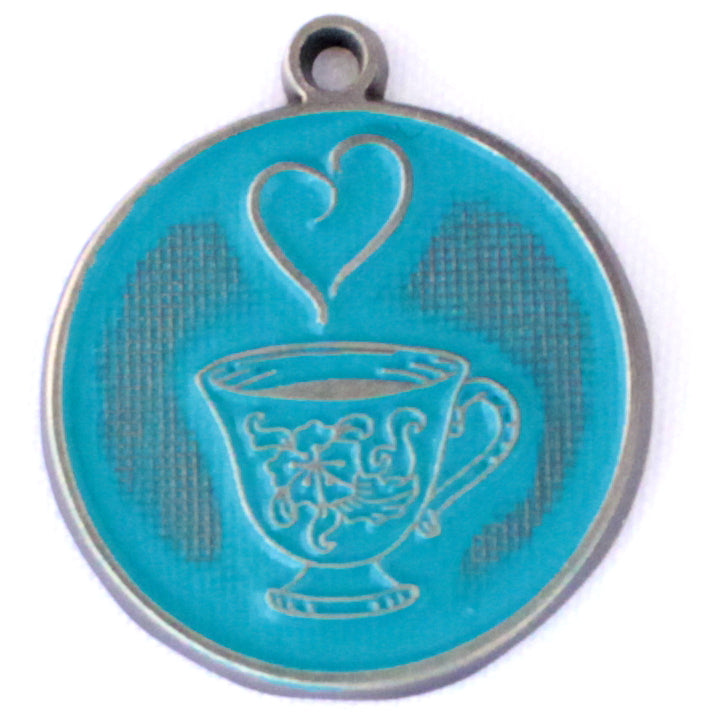 Steaming cup of love charm with blessings and gratitude, designed by Nikki Carpenter, hand-painted in Denver, CO, hypoallergenic, available as charm on card, bracelet, or necklace.