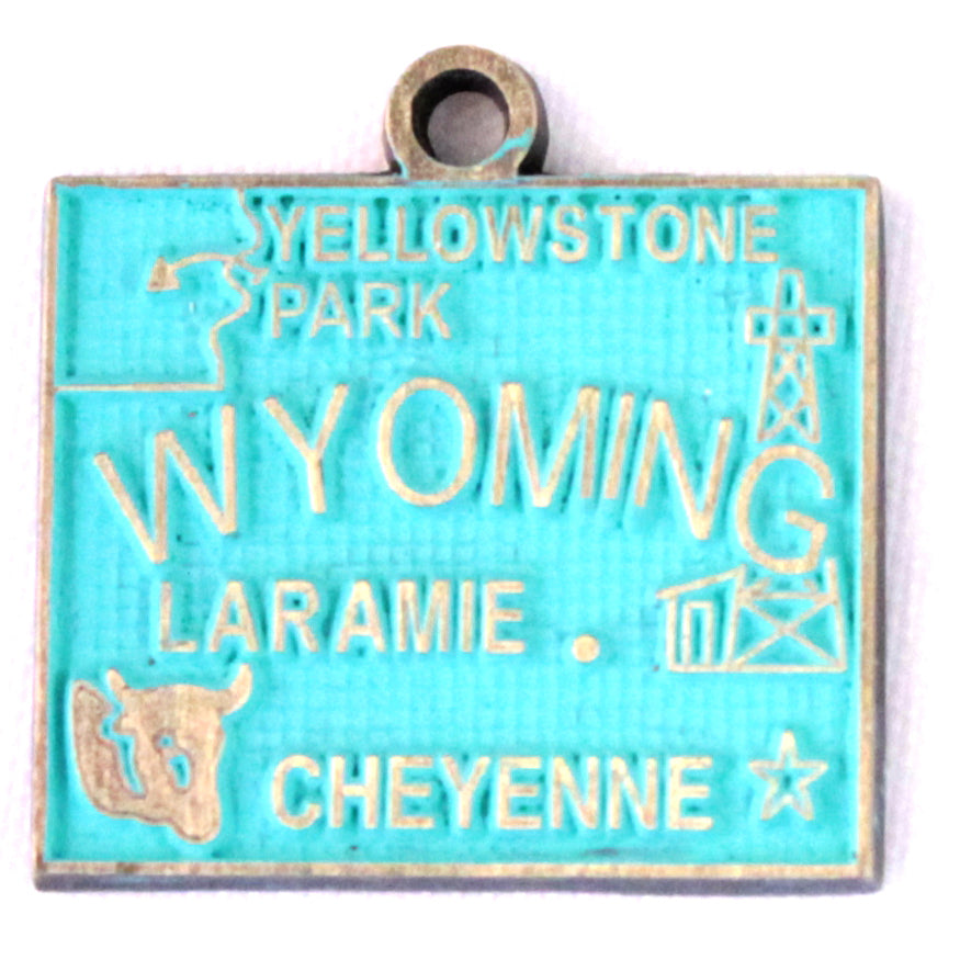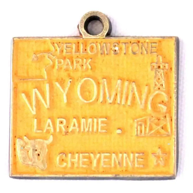 This Wyoming State Charm features the Cowboy State map highlighting the state’s plentiful cattle, an oil drill, and Yellowstone National Park.